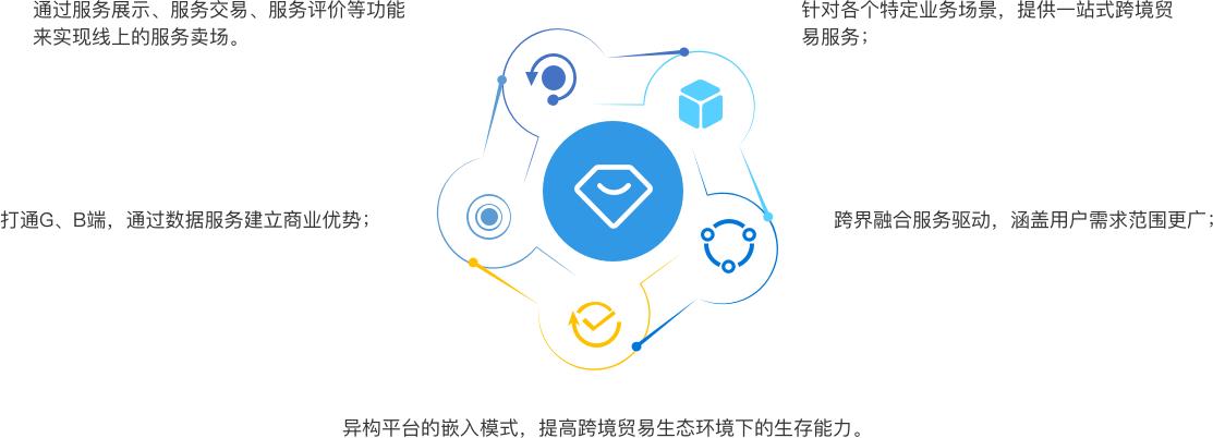 該產品為跨境貿易相關的政府部門、商家或個人對接、提供服務的互聯網平臺。服務種類包含但不限于: 云端軟件類服務(SaaS服務),云端數據類服務(DaaS服務),線下服務的線上交易與跟蹤(云服務)。金年会app下载官网云商作為平臺的主辦方,以第三方營運者的角色介入,通過聚合對外貿易環境中生態的力量,為外貿參與者提供的配套一站式服務供應鏈平臺;為服務的供應商與需求方提供技術支持、信息及交易流通的平臺。