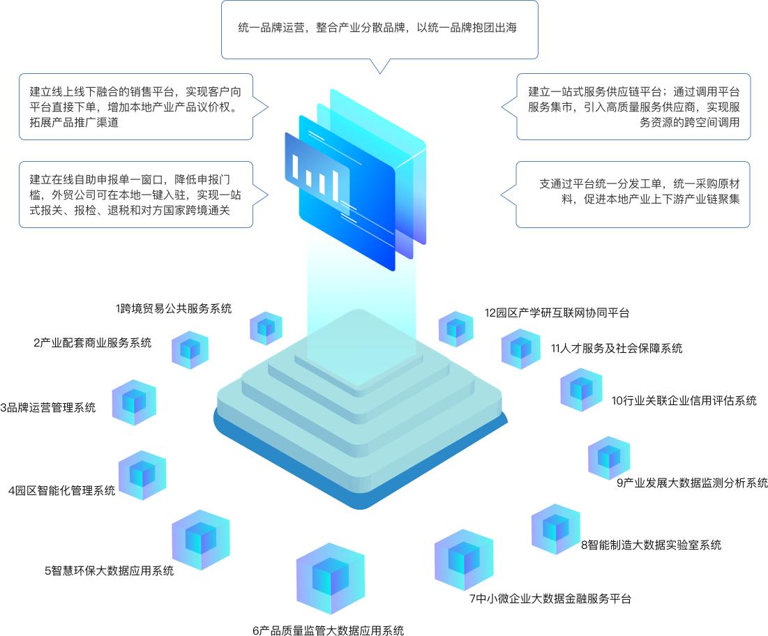 平臺以幫助地方產(chǎn)業(yè)縮短產(chǎn)業(yè)聚集周期,加速產(chǎn)業(yè)升級步伐,打通產(chǎn)業(yè)出海通道為核心驅(qū)動目標(biāo),通過優(yōu)化政府外貿(mào)相關(guān)公共服務(wù)流程,將公共服務(wù)窗口從線下搬到線上,縮短企業(yè)對外貿(mào)易辦事成本,同時引入貿(mào)易配套服務(wù)產(chǎn)業(yè),發(fā)展成以政府公共服務(wù)與對外貿(mào)易配套服務(wù)深度融合的服務(wù)貿(mào)易供應(yīng)鏈形態(tài),疊加智能制造升級服務(wù),幫助產(chǎn)業(yè)實(shí)現(xiàn)產(chǎn)業(yè)升級、產(chǎn)業(yè)整合和產(chǎn)業(yè)出海。